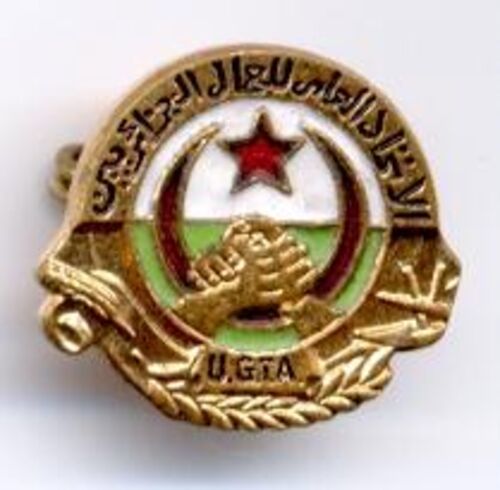 今回のバッジは、おそらくアルジェリアの、たぶん労働組合のバッジ。 緑と白のカラー、星と三日月のデザインは、ちょうどアルジェリア国旗を縦にした形と同じである。 また、がっちりと組んだ握手の意匠は労働組合に典型的である。 詳細は不明。なんて書いて…