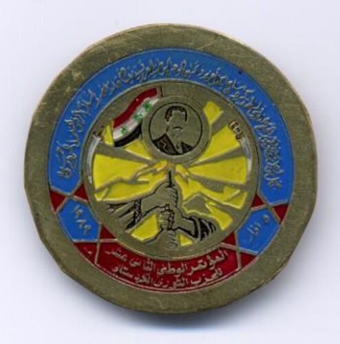 フセインの肖像の入ったバッジ。1989年の文字が見える。クルド革命党のバッジらしいが、詳細は不明である。 複数の手が、イラク国旗とその上のフセイン大統領を支えている意匠。 中央に見える黄色く描かれた島のようなものは何だろうか? バッジをよく見…