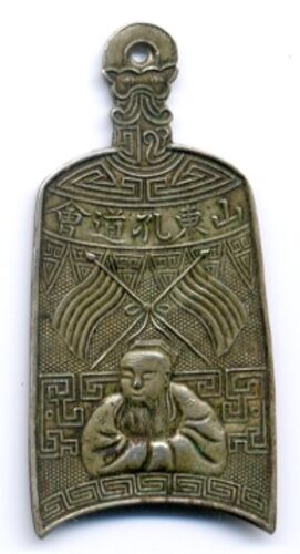 ついでなのでもうひとつ儒教関係。「山東孔道会」なる儒教組織の徽章。裏面にはシリアルナンバーが刻印されている。ツクリはなかなか良い。 縦60mm近くもあって、かなり大きい部類にはいるだろう。全体の形は、中国の古い徽章にたまに見かける吊り鐘型。描か…
