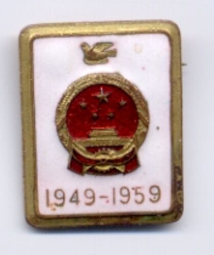 中国国慶節バッジは色々あるのだが、今日は建国10周年のバッジを紹介する。 上に描かれているのは平和の鳩、中央は国章。下には「1949-1959」とある。小ぶりなバッジだが、白地に赤の七宝と金メッキのコントラストが全体として柔らかいイメージを…