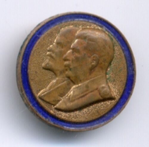 レーニンと並んだスターリン像。ごく小さいもので、ごくおとなしいデザイン。周辺を囲む青い七宝が全体に洗練された雰囲気にしている。スターリンバッジは、レーニンバッジほど多くはないが、スターリンが完全に否定された現在でも、残されている数はそれで…