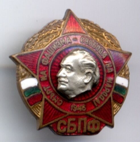 こちらも戦後ブルガリア建国の父、ディミトロフの肖像がついた反ファシスト同盟バッジ。 特に奇をてらったデザインというわけではないし、ツクリも優れているということもないが、配色といいデザインといい、バッジとしてはとても安定感のある良いバッジだ。