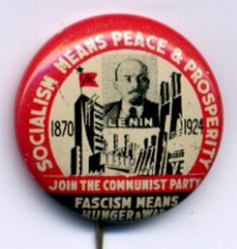 さて、アメリカにも共産党はあるのであって、レーニンは彼らの偶像である。 これはおそらく30年代に作られたと思われる。 中央にはレーニンの肖像、ソ連国旗を掲げたビルや工場群は、おそらくソ連5か年計画の成功を讃えたものだろう。 「社会主義は平和と…