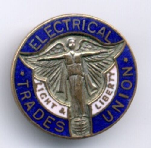 30~40年代のイギリス電気労働組合のバッジ。 「LIGHT & LIBERTY」というスローガンと、中央の女神像(?)。像の足元に見える球形のものは、電球であろうか。 こういうバッジ、いいなあと思う。 電気労働組合のスローガンがこれですよ。「明かりと自由…