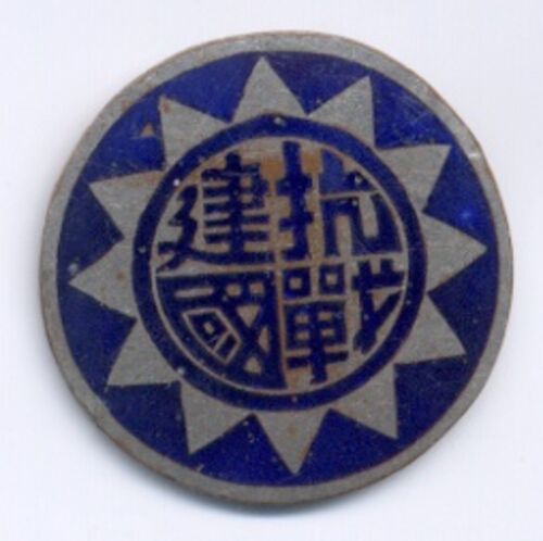 抗日戦争(日中戦争)期の中国のスローガンバッジ。国民党のシンボル青天白日の中央にスローガンが入る。 汪兆銘は、国民党の幹部であるが、日本との戦争が激化する中、徹底抗戦を主張する蒋介石と対立。1940年、ついに袂を分かって南京を首都とするもう…