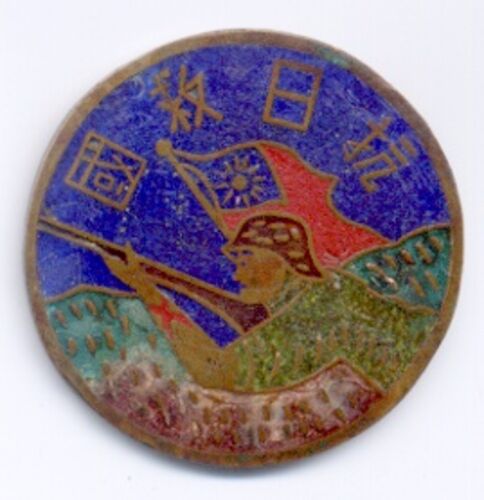もうひとつ中国の抗日戦争期スローガンバッジを。 こちらはズバリ、「抗日救国」。 おもしろいのがデザインで、中華民国の国旗を背景に、山野に伏した兵士が銃を構えている。かぶっているのはドイツ軍のM35型ヘルメットか(ちなみにスターウォーズのダー…