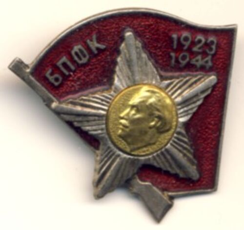 ブルガリアの反ファシストバッジ。たなびく赤旗と銃は解放と革命のシンボル。 中央の人物はゲオルギー・ディミトロフ。