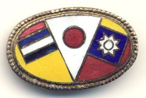 この前、「日独伊」ならぬイタリア製の「伊独日」同盟バッジを紹介したが、あのバッジを見て思い出したのがこれ。 裏面にも何も書いてないのだが、見ての通り日満華の3国旗のバッジ。 日本国旗を中心に、向かって左に満州国国旗、右に中華民国(カイライの…