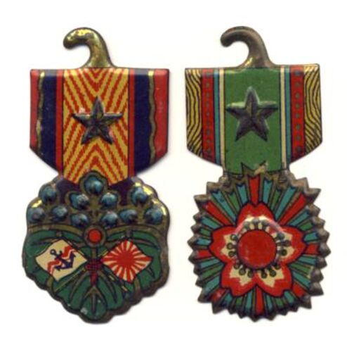 これまでも子供用オモチャの勲章を紹介してきたが、それらは一応、ホンモノの日本勲章をマネしてつくられていた。まあ少なくとも、どの勲章に似せたつもりなのかくらいはわかるものだった。 ところが、今日紹介する2点は、全くワケが分からない。勲章風の形…