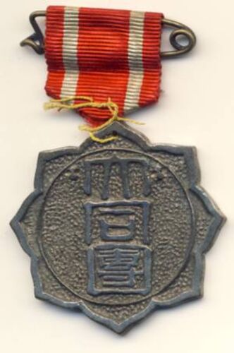 鮮やかな6色のリボンが印象的なこのメダル。中央には桜花と「仏」の文字。 その周りには?b>Young Men's Buddhist Association」と英語が書かれ、枠を飾るのは西本願寺の寺紋とされる「下がり藤」?br /> 裏面には、「北米桜府仏教青年会章」とこちらは漢字表…