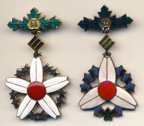画像は、北海道滝川市の名誉市民章と功労章である。 名誉市民(町民、村民)制度を制定している市町村は多いが、これは功労章とデザインがセットになっているところがおもしろい。 全体の大きさやコンセプトは共通していて、名誉市民章の方は5弁の花、功労…
